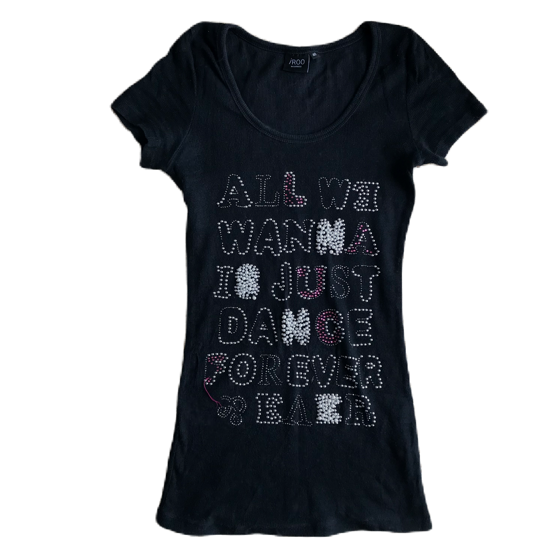 Black Ribbed Lettering Rhinestone & Pearl Long Tee